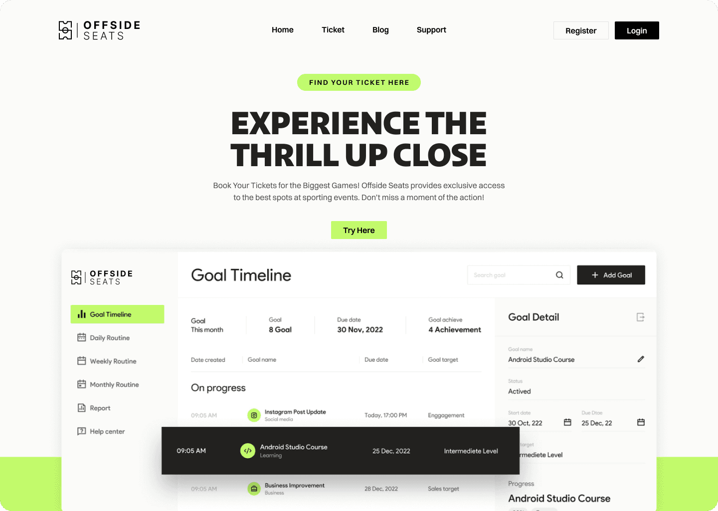 Pour Offside Seats, une marketplace de billets en ligne, j’ai conçu les écrans clés desktop (accueil, événements, sélection des sièges, connexion) pour une interface intuitive et cohérente avec l’identité de la marque, avec plusieurs itérations pour affiner le design.